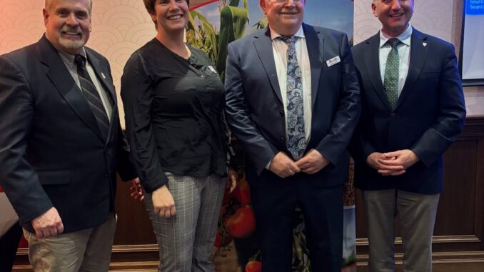 Jim Brackett, second from right, was acclaimed as president of the KFA for a second term at the annual AGM in Chatham on Dec. 18. Pictured are MPP Steve Pinsonneault, left, Maaike Campbell, Lambton Middlesex OFA Director, and MPP Trevor Jones. Photo submitted to The Ridgetown Independent News